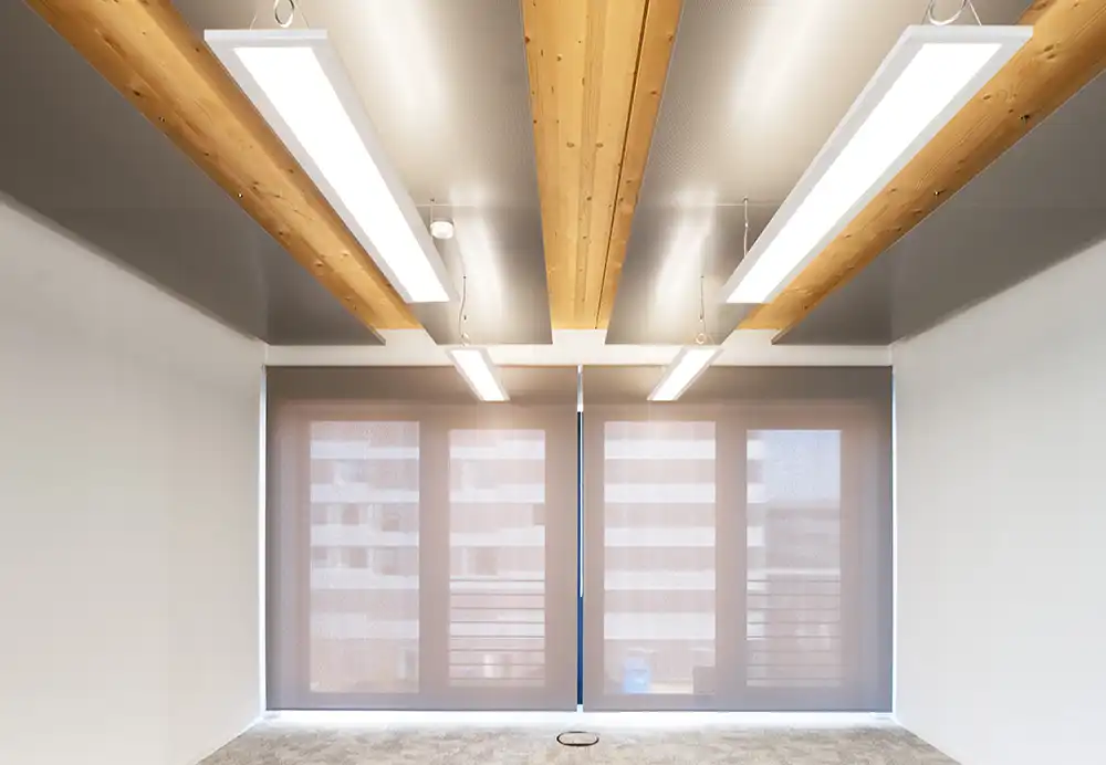 Die tragenden Holz-Flächenelemente erfüllen höchste Ansprüche an Schallschutz und Brandschutz F90 / REI 90. Sie schaffen ein gesundes Raumklima mit optimaler Luftfeuchtigkeit und sorgen so für eine spürbar bessere Wohlfühl-Atmosphäre für Mitarbeitende. Gleichzeitig verbessern sie die Ökobilanz des Gebäudes durch eine CO₂‑Reduktion gegenüber reinem Stahlbetonbau.